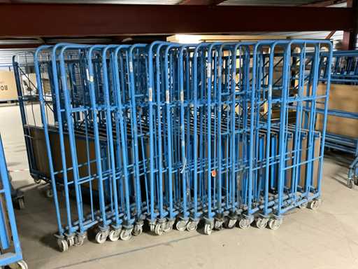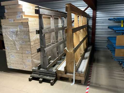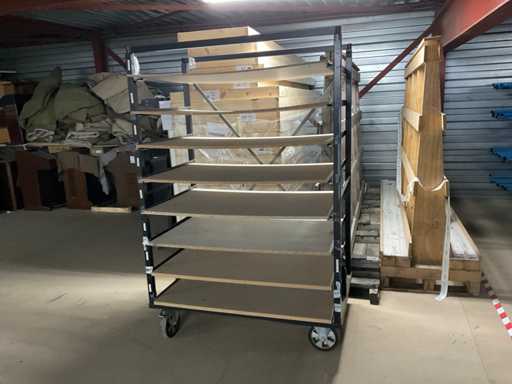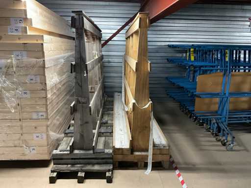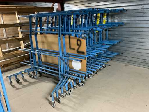 Consisting of: 10x L-frame 220x116x183 cm, 18x L-frame 140x64x173 cm, 16x 2-tier furniture trolley, 1x floor Warehouse trolley, 2x yoke length approximately 300 cm and height 200 cm., 22x wooden frame.