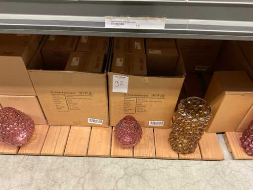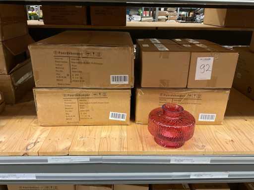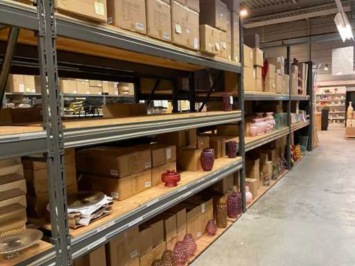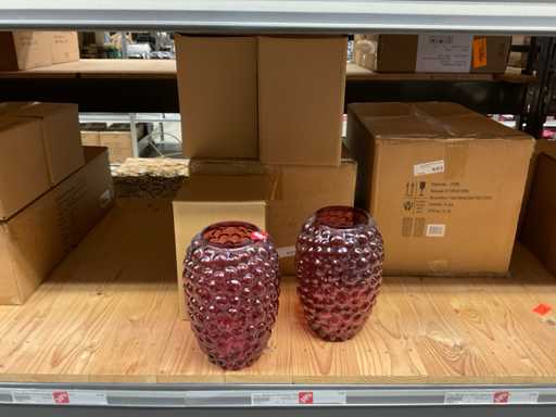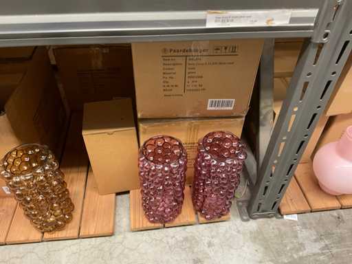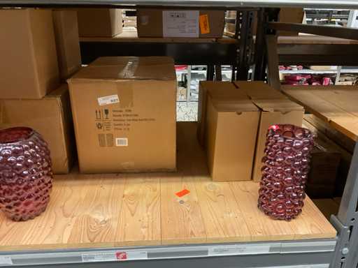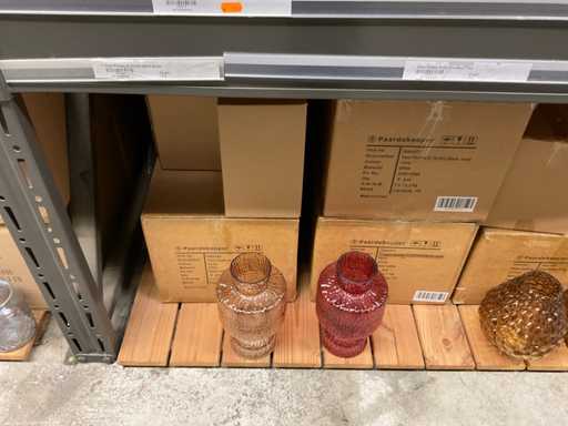 Various vases in 1 shelf section in various shapes, colors and sizes.