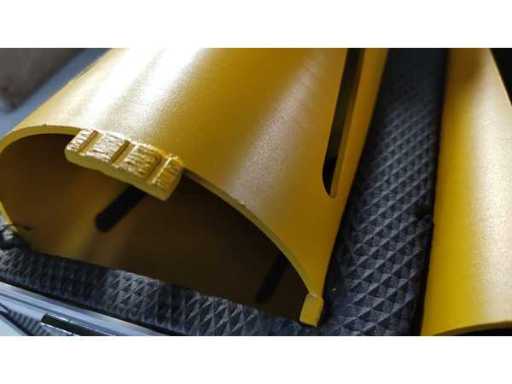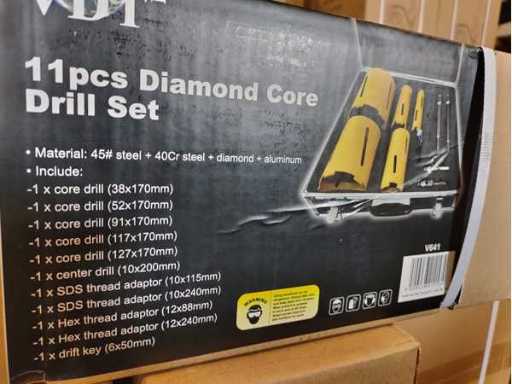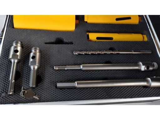 Core drill set consists of 'Heavy-Duty' steel drills with diamond cutting segments. For dry drilling of precise holes in concrete. To be used on drills with a safety clutch. 5 core drills (38, 52, 91, 117 and 127 mm) all 170mm long, 2 x short and 2 x long shaft necks (SDS-Plus and hexagon), guide drill and ejector pin. The set comes in an aluminum case.