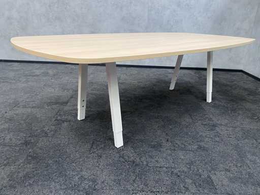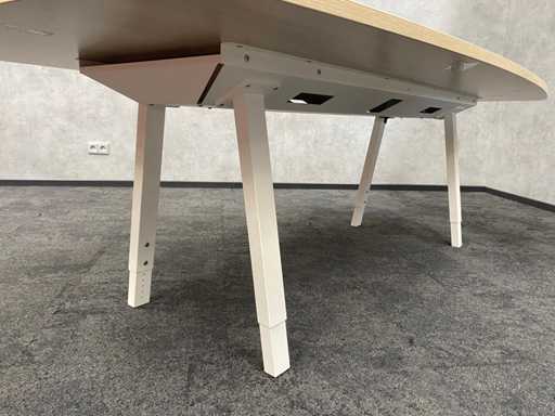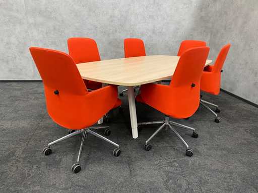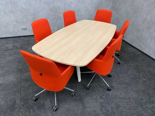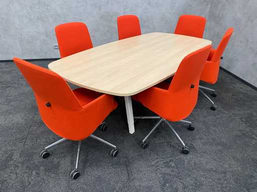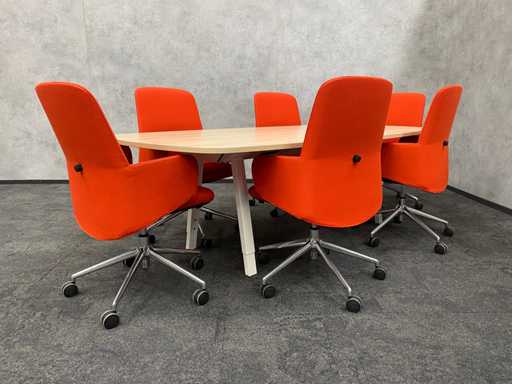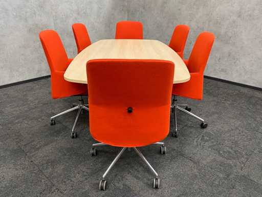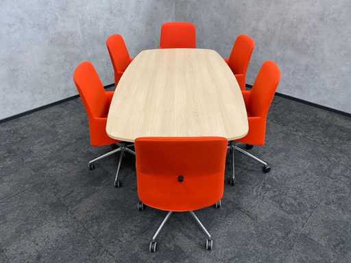 lot consisting of 1x Vitra Joyn conference table. table with new melamine oak color table top and white metal height adjustable Vitra Joyn frame. ---- 6x Donati rotatable, mobile design armchair with height-adjustable seat