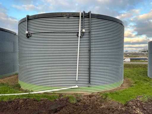 Diameter 7040 mm; height 4220 mm; Water silo consisting of steel plates; felt inside; rubber inner pocket; Stainless steel ratchets and released bolts and nuts; is dismantled and prepared for transport by the seller;