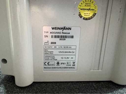 Battery-powered suction device from WEINMANN, type ACCUVAC Rescue (model RDS Accuvac 2). Year of manufacture 2009, serial number 26329. Operating time approx. 60 minutes, battery: 12 V / 2.8 Ah / Ni-Cd, charging range: 12–13.8 V. CE 0197 certified, IPX1. Device is sold including secretion container, hose system and side transport bag.