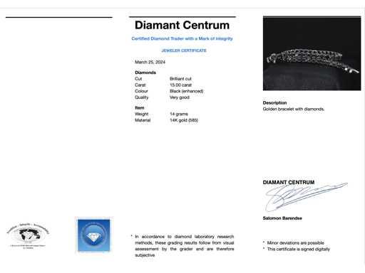 Diamond: Natural; Quantity: 47 pieces; Cut: Brilliant cut; Weight (carat): 16.00 carat; Color: Black (enhanced); Cut quality: Very nice; Jewel: Bracelet; Weight: 14 grams; Dimensions/length: 18 cm; Material: 14k gold (585); Condition: New; Packing: Luxury jewelry box; Explanation: The quality has been taken from the report belonging to the item. The valuation is an assessment of a certified diamond dealer, based on consumer prices; Consumer price: € 9,345