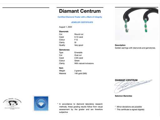 Diamond: Natural; Cut: Round cut; Weight (carat): 0.12 carat; Color: F-G; Purity: SI; Cut quality: Very nice; Gemstone: emerald; Cut: Oval; Weight (carat): 2.00 carat; Color: green; Jewel: Earrings; Weight: 2 grams; Dimensions/length: 20 x 16 mm; Material: 14 carat (585); Condition: New; Packing: Luxury jewelry box; Explanation: The quality has been taken from the report belonging to the item. The valuation is an assessment of a certified diamond dealer, based on consumer prices; Consumer price: € 2,940