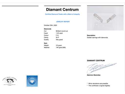 Diamond: Natural; Cut: Brilliant and round cut; Weight (carat): 1.25 carat; Color: F-G; Purity: SI-P; Cut quality: Very nice; Jewel: Earrings; Weight: 3.5 ounces; Dimensions/length: Diameter: 20 mm; Material: 14 carat (585); Condition: New; Packing: Luxury jewelry box; Explanation: The quality has been taken from the report belonging to the item. The valuation is an assessment of a certified diamond dealer, based on consumer prices; Consumer price: € 4,428