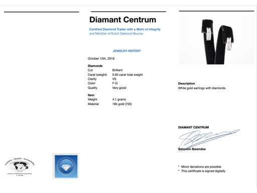 Diamond: Natural; Cut: Brilliant cut; Weight (carat): 0.65 carat; Color: F-G; Purity: USA; Cut quality: Very nice; Jewel: Earrings; Weight: 4.1 ounces; Dimensions/length: 10 x 10 mm (adjustable); Material: 18K gold (750); Condition: New; Packing: Luxury jewelry box; Explanation: The quality has been taken from the report belonging to the item. The valuation is an assessment of a certified diamond dealer, based on consumer prices; Consumer price: € 5,723