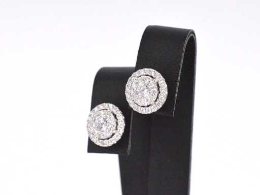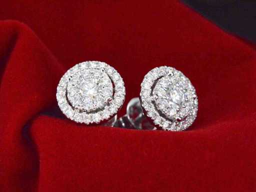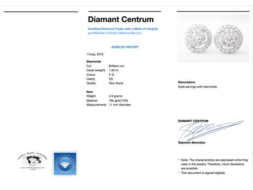 Diamond: Natural; Cut: Brilliant cut; Weight (carat): 1.60 carat; Color: F-G; Purity: USA; Cut quality: Very nice; Jewel: Earrings; Weight: 4.9 grams; Dimensions/length: Diameter: 11 mm; Material: 18K gold (750); Condition: New; Packing: Luxury jewelry box; Explanation: The quality has been taken from the report belonging to the item. The valuation is an assessment of a certified diamond dealer, based on consumer prices; Consumer price: € 11,078