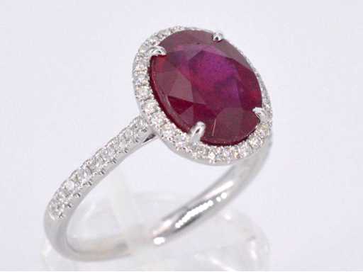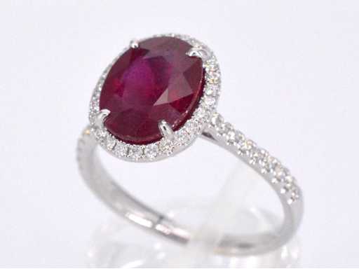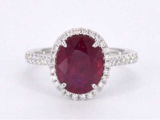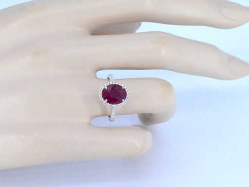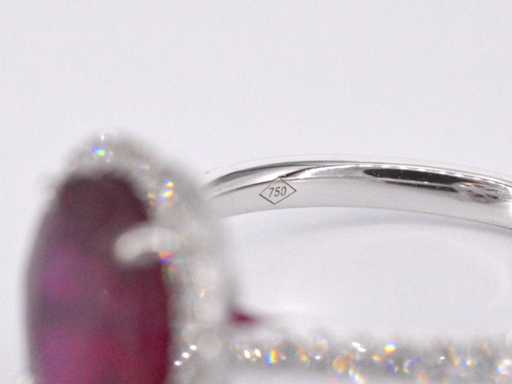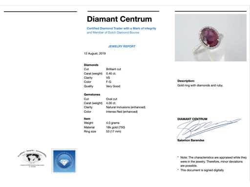 Diamond: Natural; Cut: Brilliant cut; Weight (carat): 0.40 carat; Color: F-G; Purity: USA; Cut quality: Very nice; Gemstone: Ruby; Quantity: 1 piece; Cut: Oval; Weight (carat): 4.00 carat; Color: Intense red (enhanced); Purity: With natural inclusions (enhanced); Dimensions: 10.0 x 8.0 mm; Jewel: Ring; Weight: 4 grams; Ring size (custom made*): 53 (17 mm); Material: 18K gold (750); Condition: New; Packing: Luxury jewelry box; Explanation: The quality has been taken from the report belonging to the item. The valuation is an assessment of a certified diamond dealer, based on consumer prices; Consumer price: € 5,653
