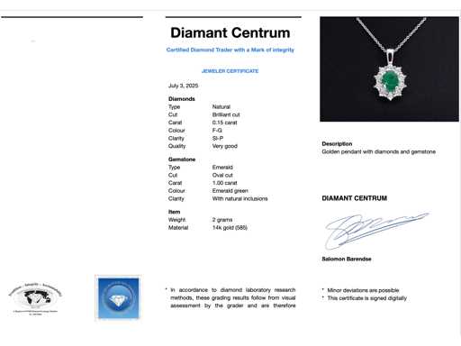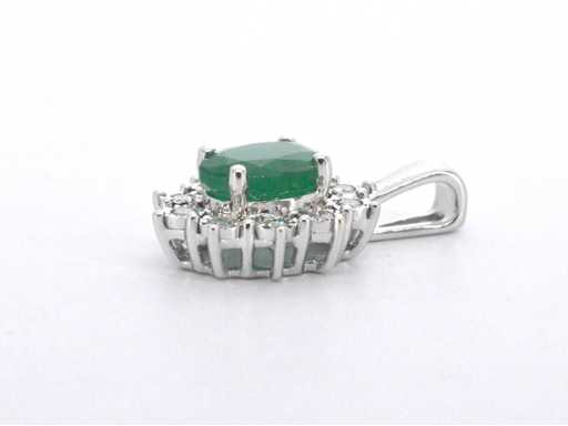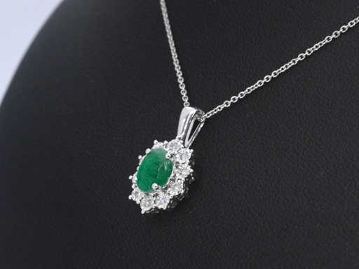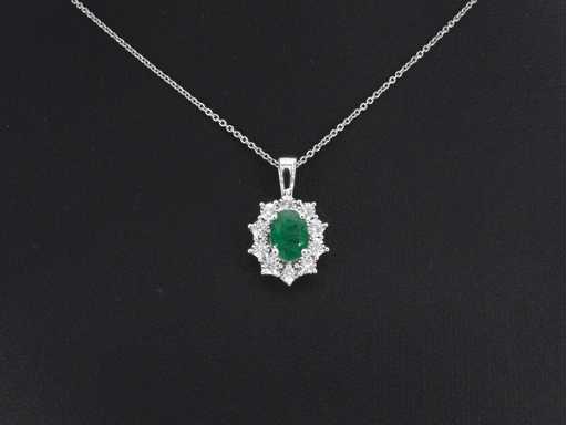 Diamond: Natural; Quantity: 10 pieces; Cut: Brilliant cut; Weight (carat): 0.15 carat; Color: F-G; Purity: SI-P; Cut quality: Very nice; Gemstone: Emerald; Quantity: 1 piece; Cut: Oval cut; Weight (carat): 1.00 carat; Color: Emerald green; Purity: With natural inclusions; Jewel: Pendant (excl. necklace); Weight: 2 grams; Material: 14k gold (585); Condition: New; Packing: Luxury jewelry box; Explanation: The quality has been taken from the report belonging to the item. The valuation is an assessment of a certified diamond dealer, based on consumer prices; Consumer price: € 2,065