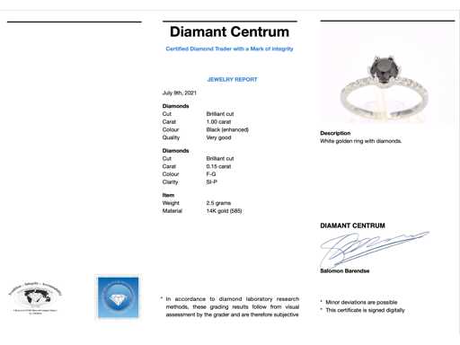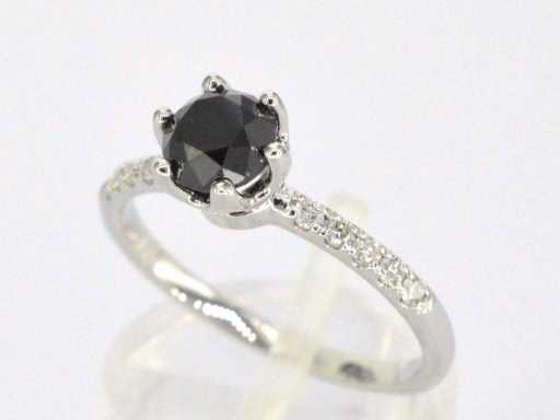 Diamond: Natural; Quantity: 1 piece; Cut: Brilliant cut; Weight (carat): 1.00 carat; Color: Black (enhanced); Purity: Opaque (enhanced); Cut: Beautiful; Diamond (secondary): White diamonds; Number of diamonds: 10 pieces; Cut: Brilliant cut; Weight (carat): 0.15 carat; Color: F-G; Purity: SI-P; Jewel: Ring; Weight: 2.5 ounces; Ring size (custom made*): 54 (17.25 mm); Material: 14 carat (585); Condition: New; Packing: Luxury jewelry box; Explanation: The quality has been taken from the report belonging to the item. The valuation is an assessment of a certified diamond dealer, based on consumer prices; Consumer price: € 2,083