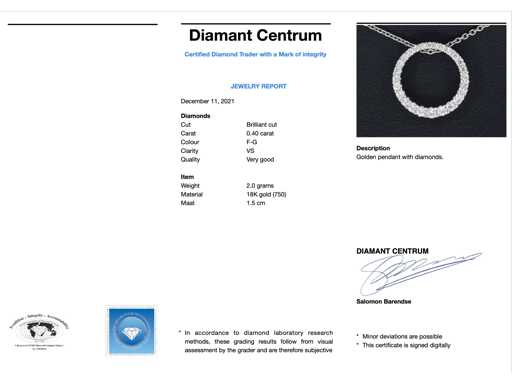 Diamond: Natural; Cut: Brilliant cut; Weight (carat): 0.40 carat; Color: F-G; Purity: USA; Cut quality: Very nice; Jewel: Pendant (excl. necklace); Weight: 2 grams; Dimensions/length: 1.5 cm; Material: 18K gold (750); Condition: New; Packing: Luxury jewelry box; Explanation: The quality has been taken from the report belonging to the item. The valuation is an assessment of a certified diamond dealer, based on consumer prices; Consumer price: € 3,500