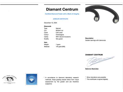 Diamond: Natural; Quantity: 1 piece; Cut: Brilliant cut; Weight (carat): 0.65 carat; Color: Champagne; Purity: With natural inclusions; Cut quality: Very nice; Jewel: Earrings; Weight: 1 gram; Material: 14k gold (585); Condition: New; Packing: Luxury jewelry box; Explanation: The quality has been taken from the report belonging to the item. The valuation is an assessment of a certified diamond dealer, based on consumer prices; Consumer price: € 1,840