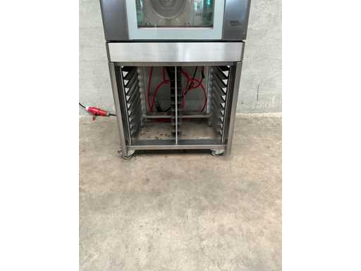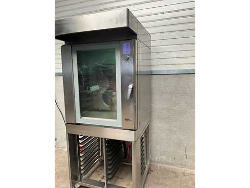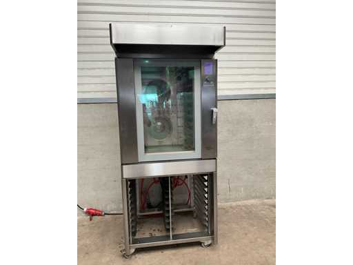 Stainless steel oven with 10 shelves on mobile stainless steel base with 20 shelves and extractor hood