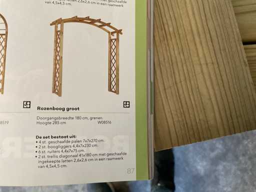 The dimensions of the rose arch are 230 x 285 cm. The large rose arch is made of preserved pine wood and has a passage width of 180 cm. The kit consists of: 4 Planed posts 7 x 7 x 270 cm, 2 arch beams 4.4 x 7 x 230 cm, 6 riders 4.4 x 7 x 75 cm and 2 diagonal trellis 41 x 180 cm. The color of the pine wood is green.