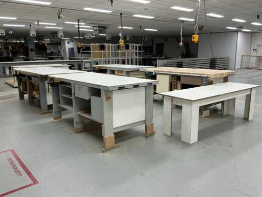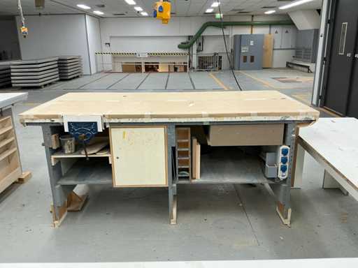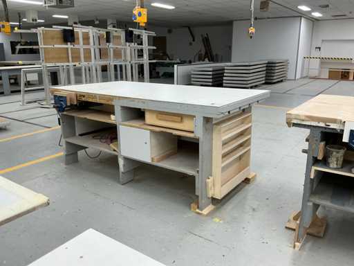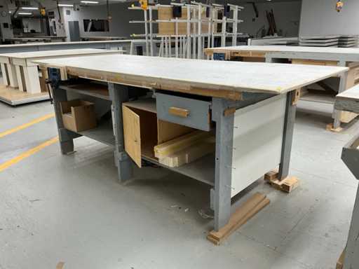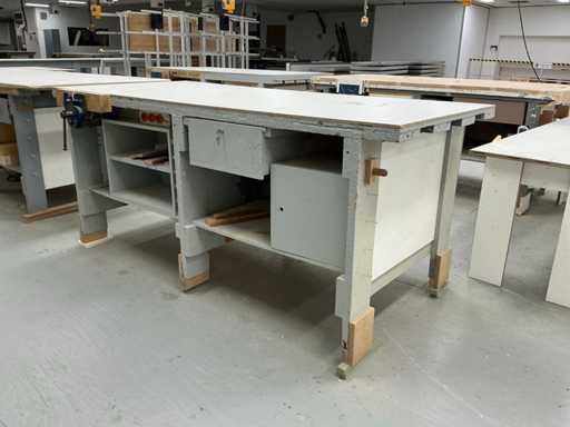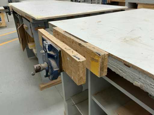Built-in vice; 1x workbench 280x117x101cm; 1x workbench 240x110x105cm; 1x workbench 244x115x105cm; 1x workbench 244x127x104cm; 1x workbench 244x80x80cm without vice