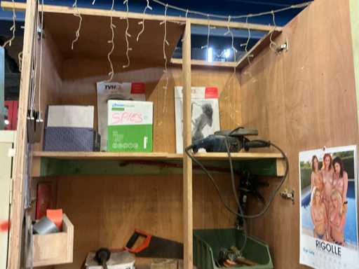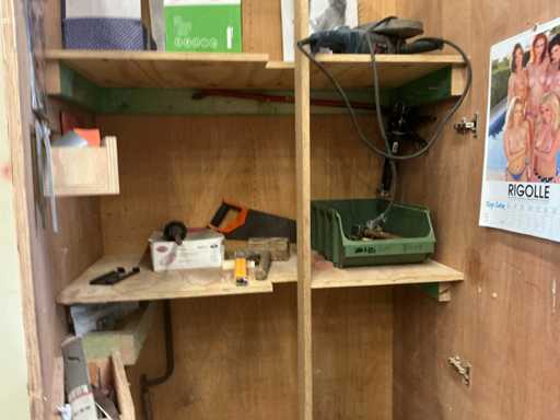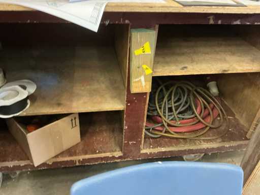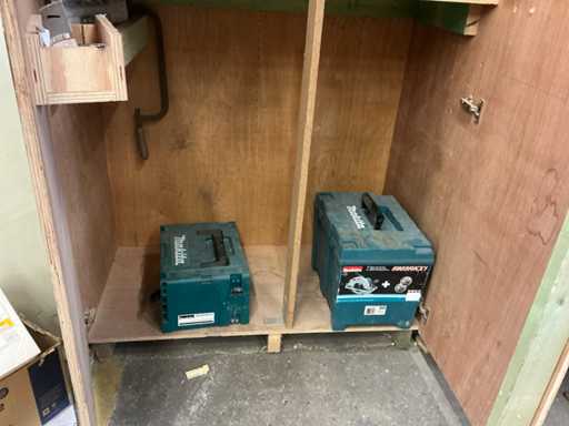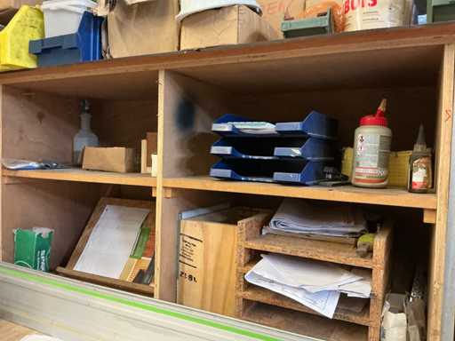 consisting of wooden workbench 2500x830x1040 mm and wooden storage cabinet 1200x600x2500 mm all with contents consisting of work material empty Makita storage cases,