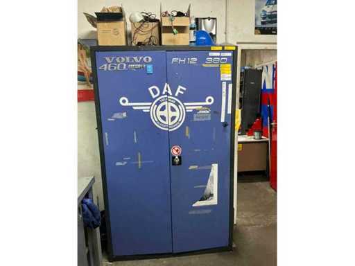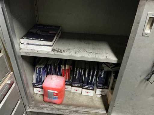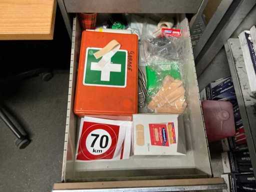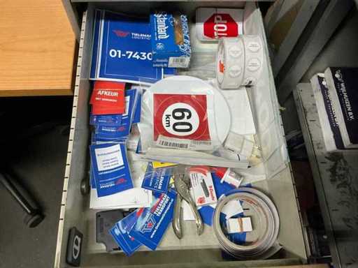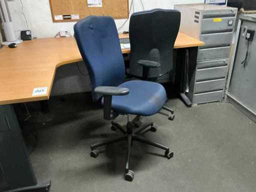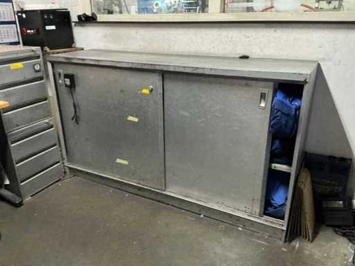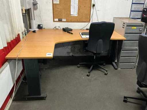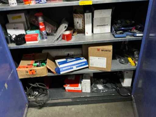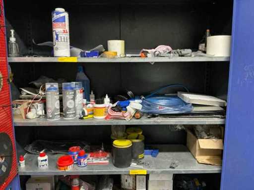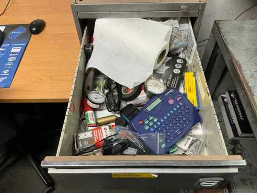 1x corner desk 200x160 cm; 2x office chair; 1x sliding door wardrobe 180x50x100 cm; 1x workshop cabinet 120x40x195 cm; 2x drawer unit; cabinets with contents; Content consisting of various parts, tools and workwear.