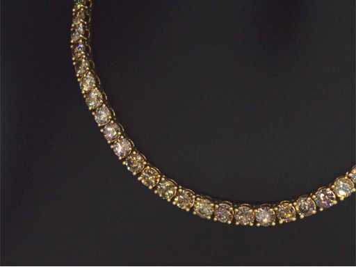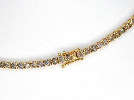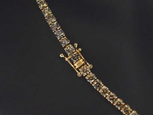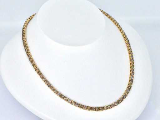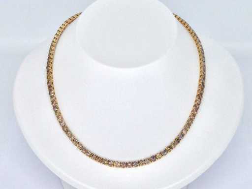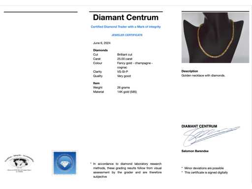 Diamond: Natural; Quantity: 101 pieces; Cut: Brilliant cut; Weight (carat): 25.00 carat; Color: Fancy gold - champagne - cognac; Purity: VS-SI-P; Cut quality: Very nice; Jewel: Necklace; Weight: 26 grams; Dimensions/length: 41 cm; Material: 14k gold (585); Condition: New; Packing: Luxury jewelry box; Explanation: The quality has been taken from the report belonging to the item. The valuation is an assessment of a certified diamond dealer, based on consumer prices; Consumer price: € 47,163