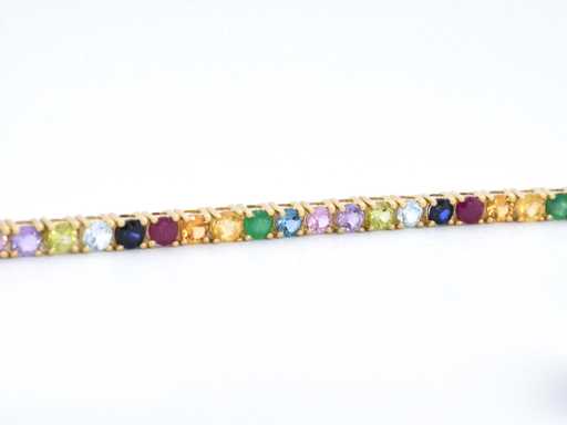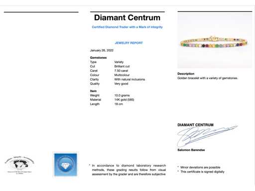 Gemstone: Rainbow; Cut: Brilliant cut; Weight (carat): 7.50 carat; Colour: multicolour; Purity: With natural inclusions; Cut: Very good; Jewel: Bracelet; Weight: 10 grams; Dimensions/length: 18 cm; Material: 14 carat (585); Condition: New; Packing: Luxury jewelry box; Explanation: The quality has been taken from the report belonging to the item. The valuation is an assessment of a certified diamond dealer, based on consumer prices; Consumer price: € 6,003