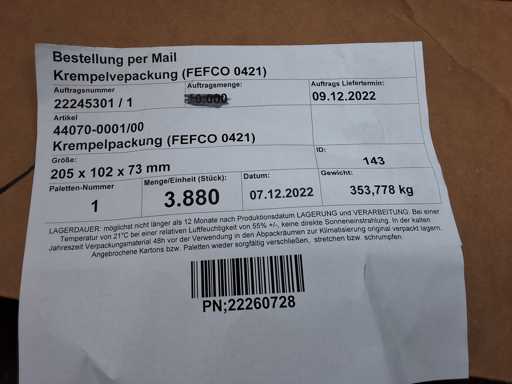 Cartons d’expédition en palette, taille 205x102x73 mm chacun, 3880 pièces