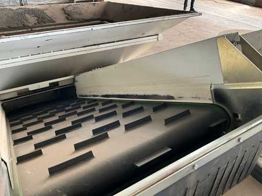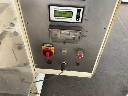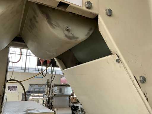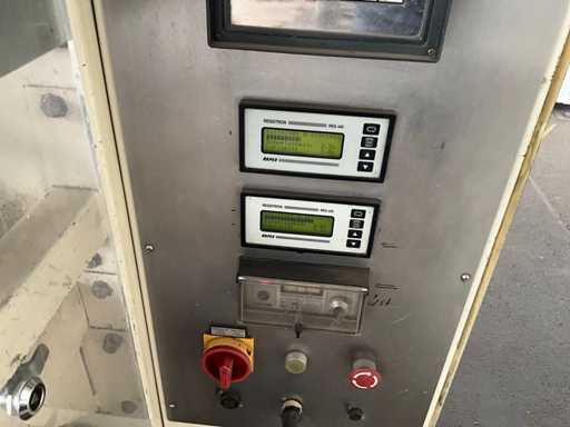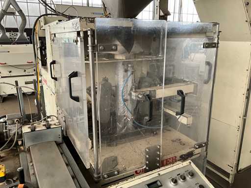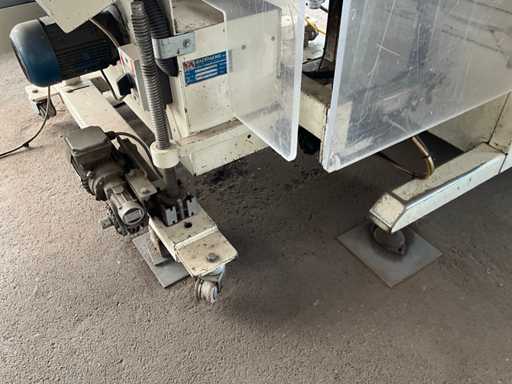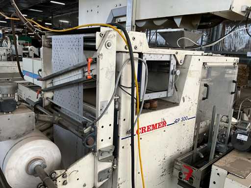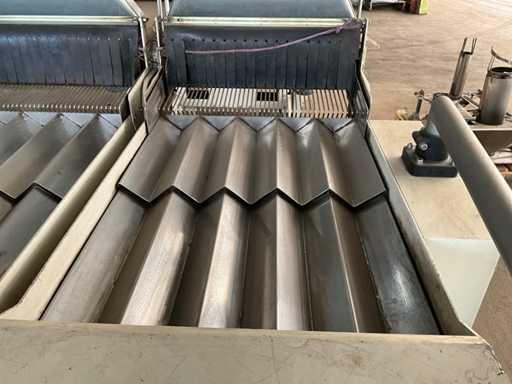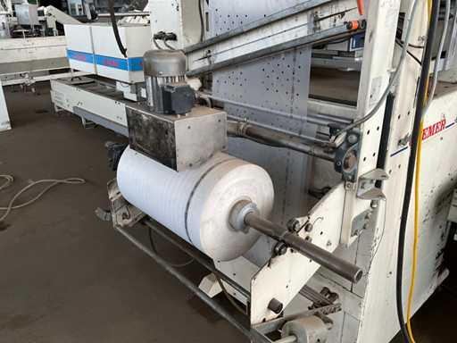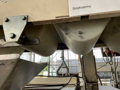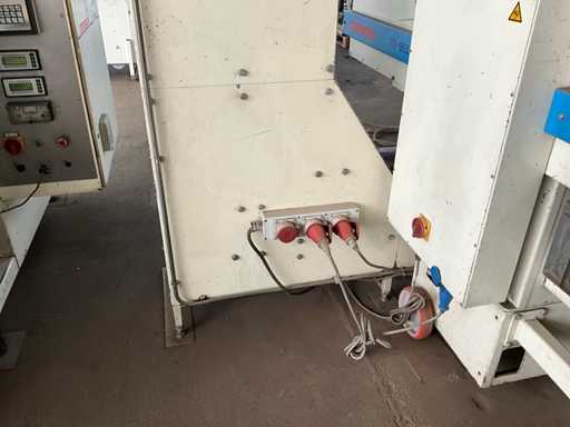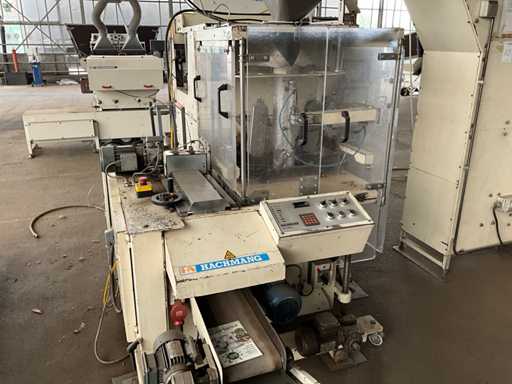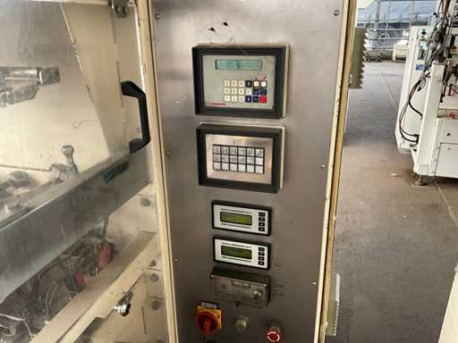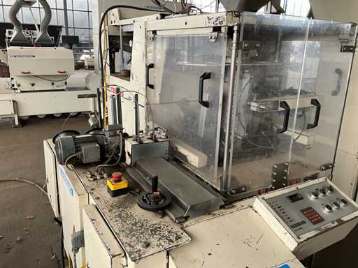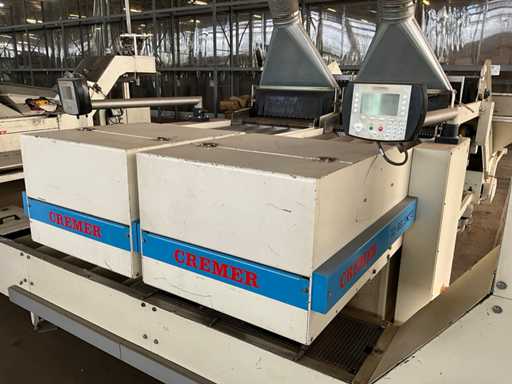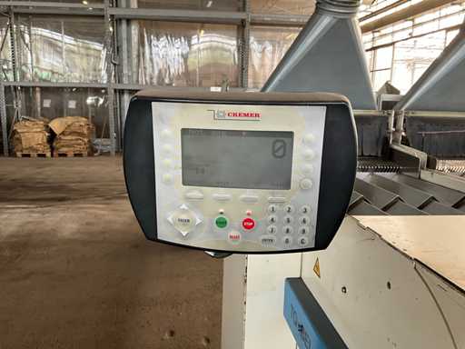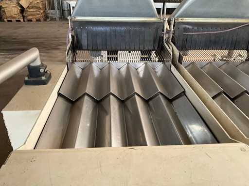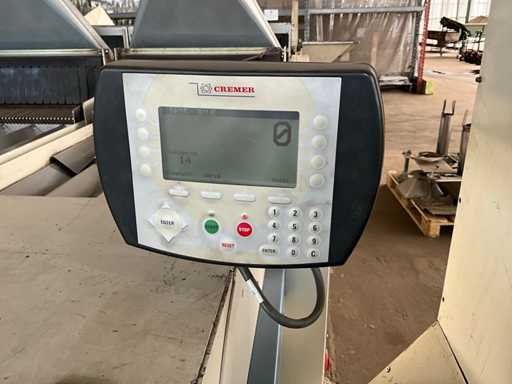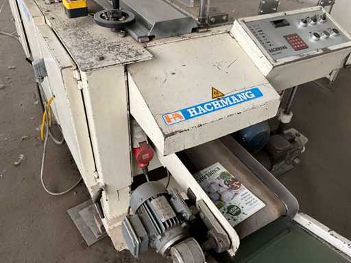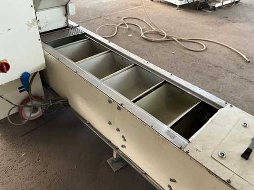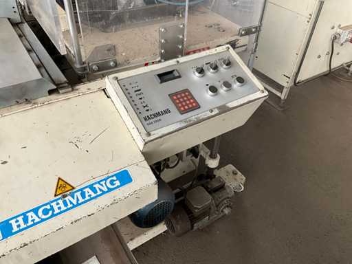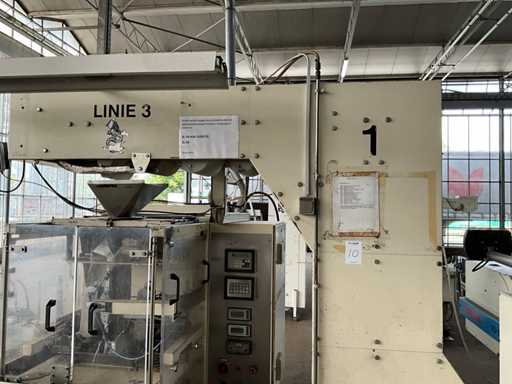 équipé d’une imprimante vidéojet, d’une barre de soudure, d’une largeur de soudure de 250 mm, d’une ligne complète composée d’une trémie, d’un élévateur, d’un tapis roulant avec extraction, d’un Cremer TQ-BEL 5112x2, de 2x 5 canaux, d’une année de construction 2005, d’un numéro de série : 557.064A, d’un élévateur Cremer TE-2500 de 1995, d’un porte-cartes Hachmang HAK200, veuillez noter ! Le terrain doit être démantelé