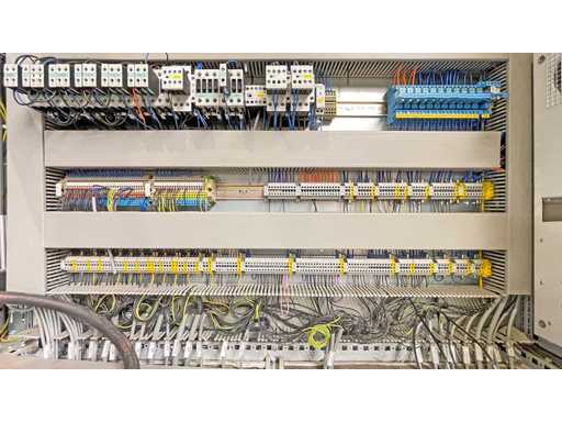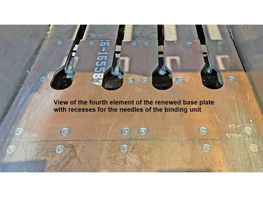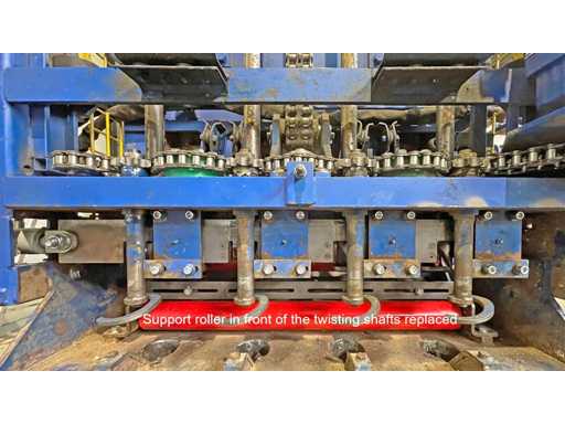 • Démontage de l’unité de binding et de torsion, démontage en pièces individuelles, desserrement de la mécanique, remplacement de tous les roulements à billes à rainures profondes et des roulements axials sur les arbres torsadés, nettoyage et réajustement des lames de fil, graissage et tension des chaînes