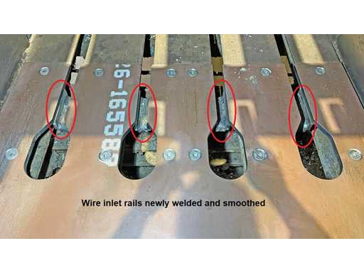 • Rails d’entrée en fil dans le plancher de la presse nouvellement soudés et lissés