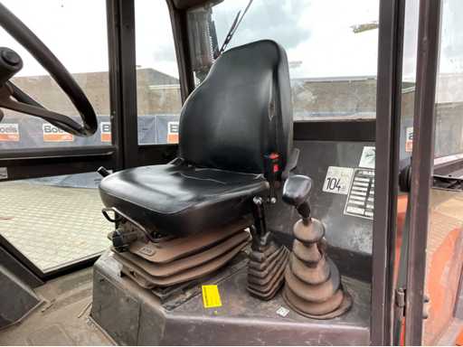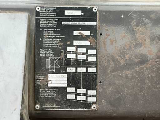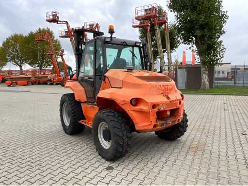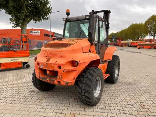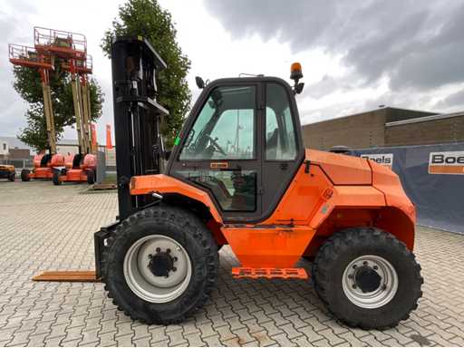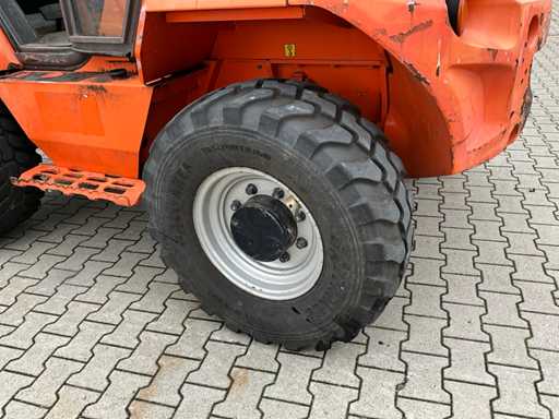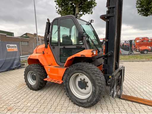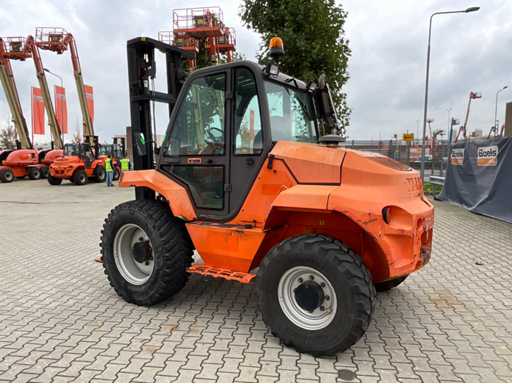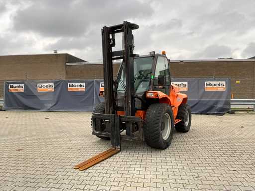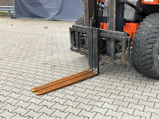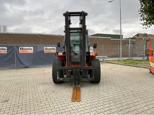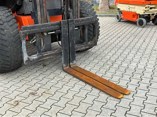 chariot élévateur tout-terrain accidenté ; Entraînement 4x4 ; cabine fermée avec vue panoramique ; pneus multi-usages ; largeur maximale au-dessus des fourches 1400 mm ; largeur de fourche 125 mm ; éclairage de travail ; feux de route ; lampe de signalisation ; état de fonctionnement ;
