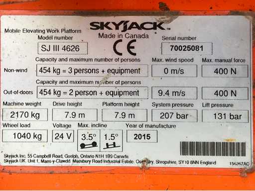 2015 SkyJack SJ III 4626 Plate-forme aérienne