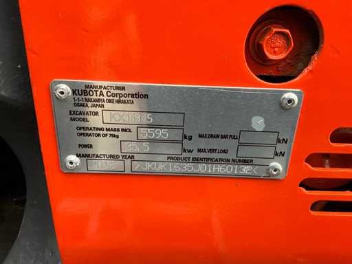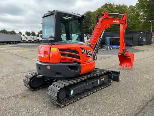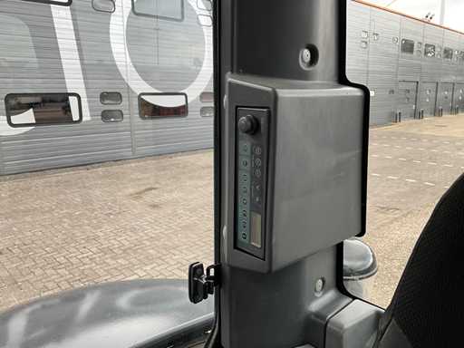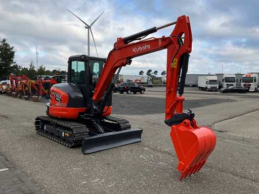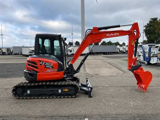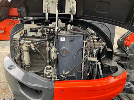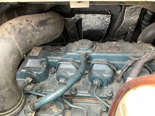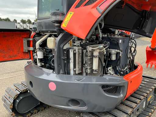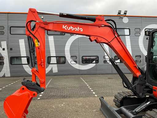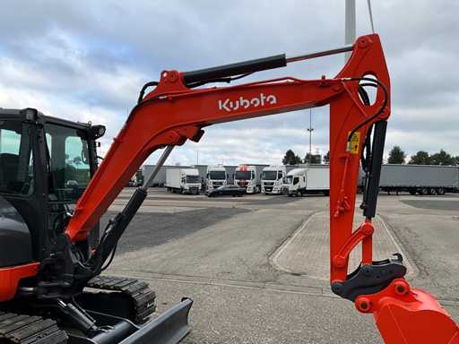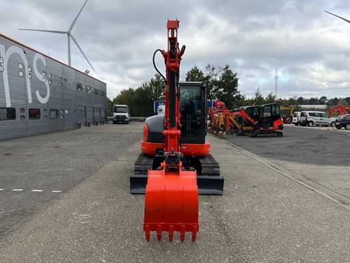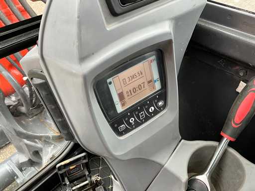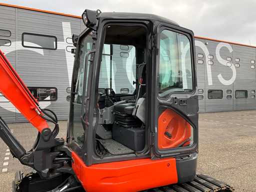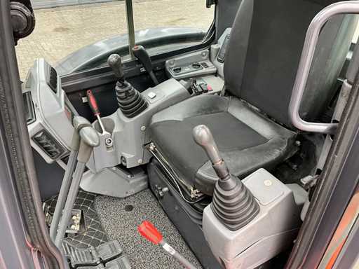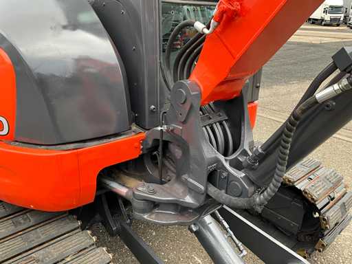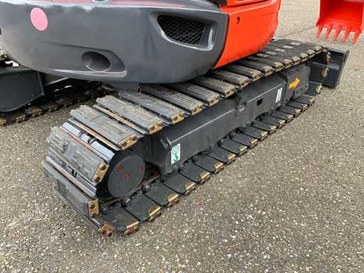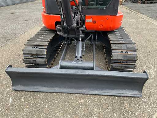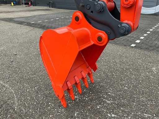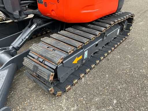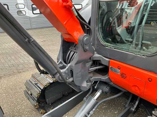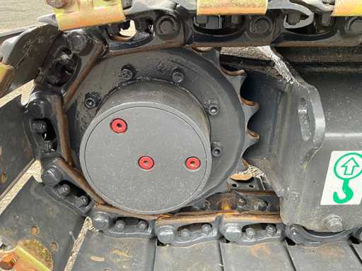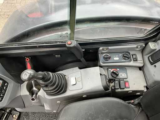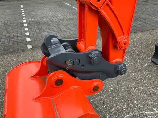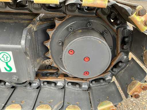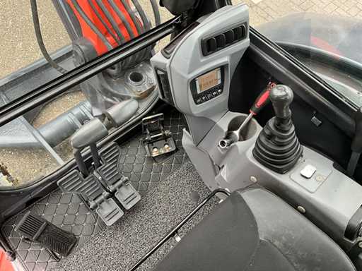 Tractopelle avec dents 700 mm, attache rapide mécanique, fonction hydraulique supplémentaire, lame coulissante 1950 mm, flèche pivotante, patins en caoutchouc sur chenilles en acier, ralenti automatique, 2ème vitesse de déplacement