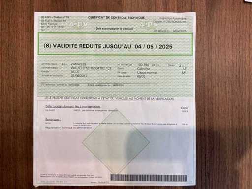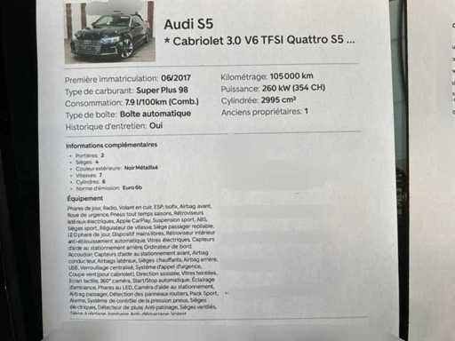 L’équipement comprend notamment des sièges sport, des sièges chauffants et ventilés, une suspension sport, un système de navigation avec écran tactile, Apple CarPlay, une caméra 360°, des capteurs d’aide au stationnement avant et arrière, un régulateur de vitesse, la climatisation automatique, un système Start/Stop, ainsi que plusieurs aides à la conduite et dispositifs de sécurité (ABS, ESP, airbags multiples, contrôle de pression des pneus). Le véhicule est également doté d’un éclairage LED, d’une capote électrique, de vitres électriques et d’un système d’appel d’urgence.