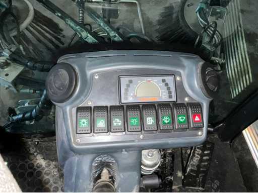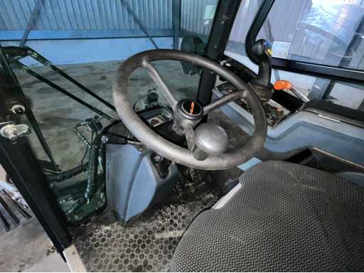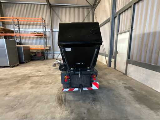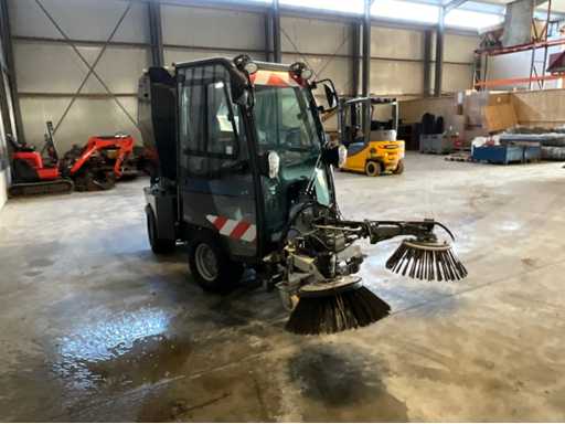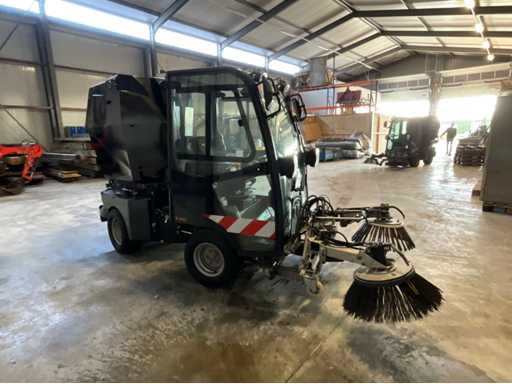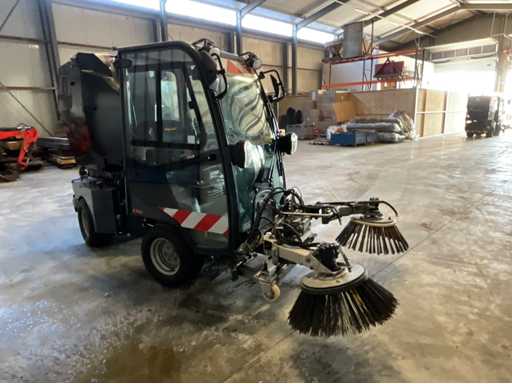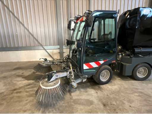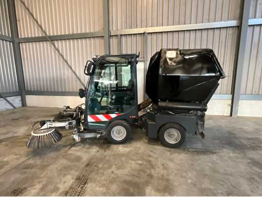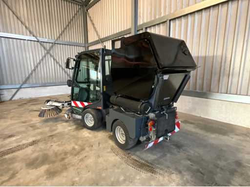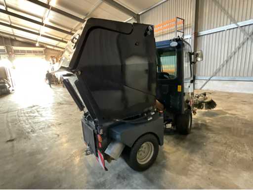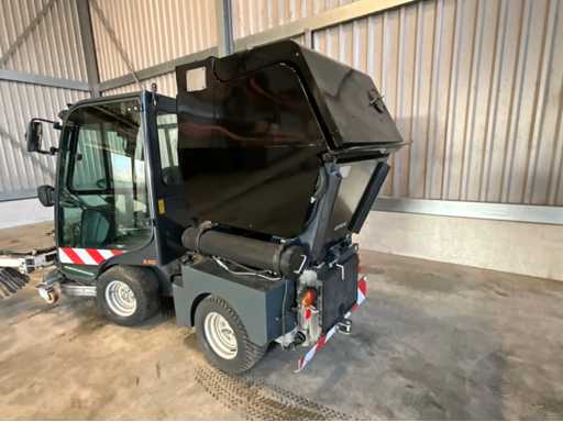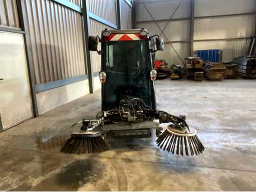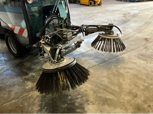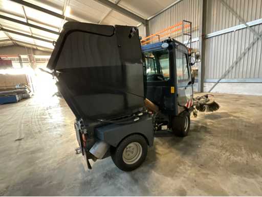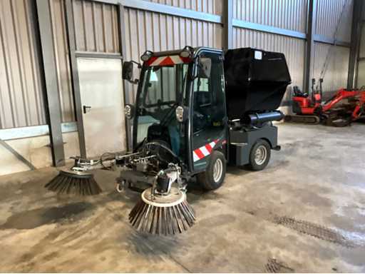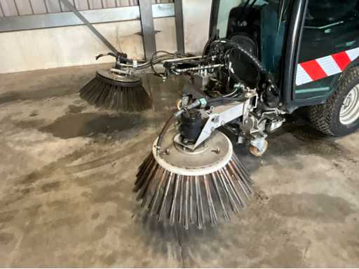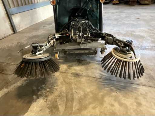 éclairage de travail ; feux de route ; lampe de signalisation ; équipé de 2 brosses balayeuses d’un diamètre d’environ 600 mm ; largeur de travail environ 1600 mm ; équipé d’une installation de brumisation d’eau ; équipé d’un conteneur basculant ; 4x pneu pneumatique ; cabine fermée ; caméra arrière ;
