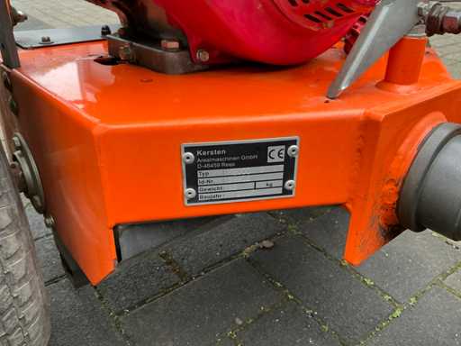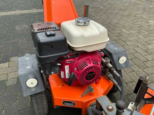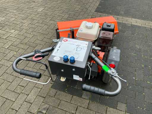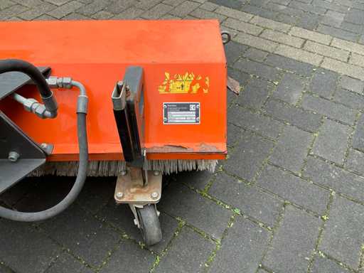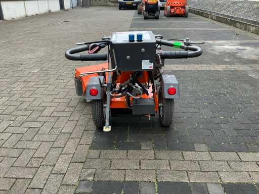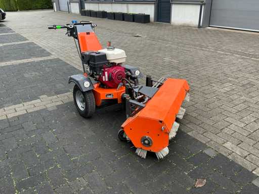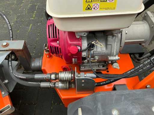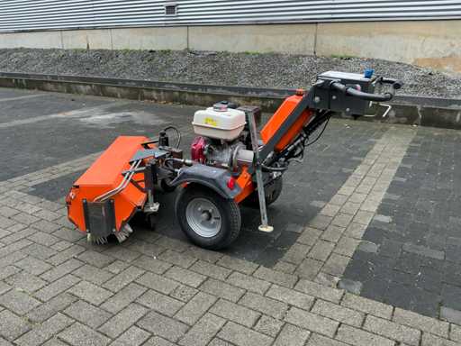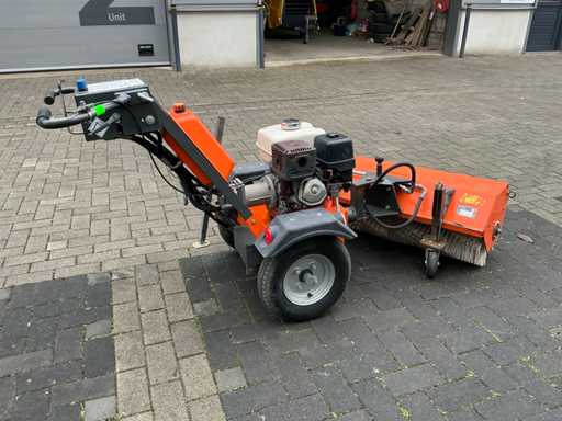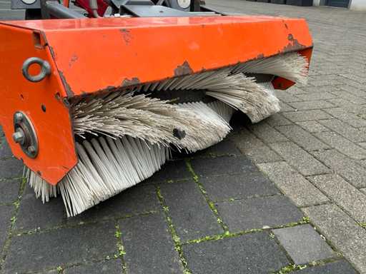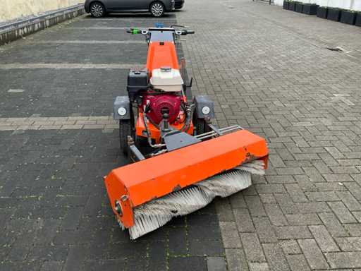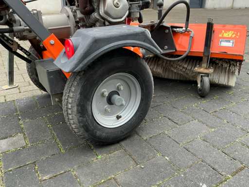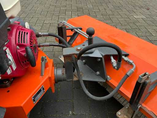 Équipé de : Moteur à essence Honda GX 270, 6,3 kw (8,4 ch), démarrage par câble, entraînement hydrostatique en continu, vitesse de déplacement de 0 à 7 km/h en marche avant et arrière, vitesse du balai réglable en continu, point d’appui, œillets de levage, balai de 100 cm type EFKM 10037 H-KU année de construction 2017 accessoire de balayage avant, entraînement hydraulique avec accouplements 1/2", double levier pour le réglage de la hauteur, angle d’inclinaison manuel à gauche et à droite, Brosse combinée en poly à 5 rangs.