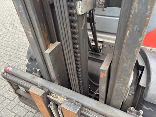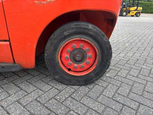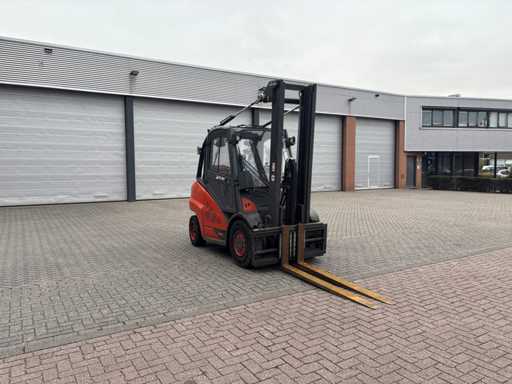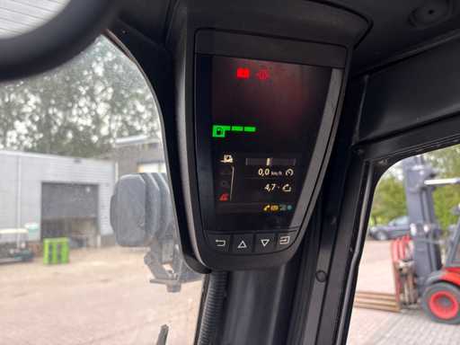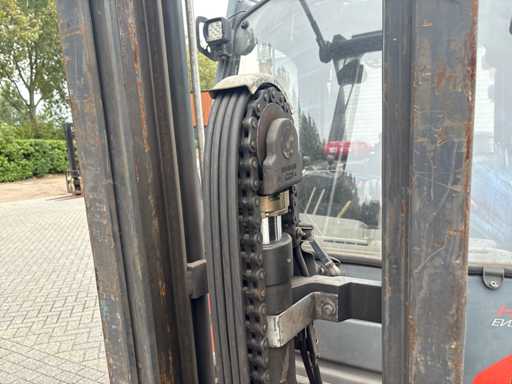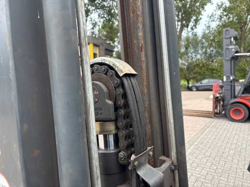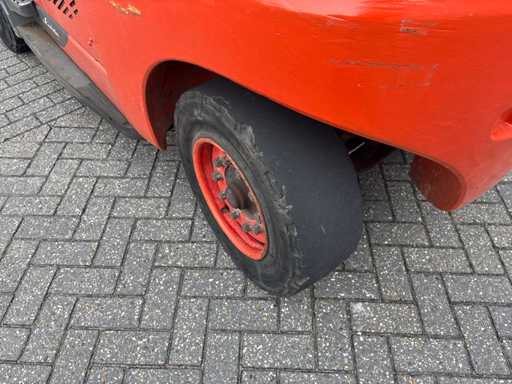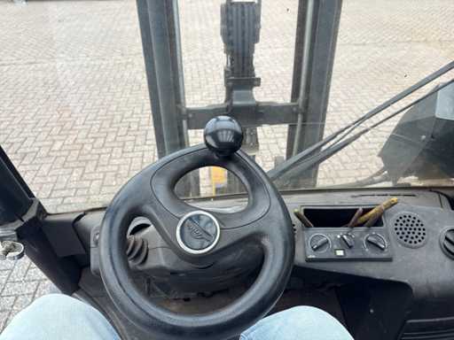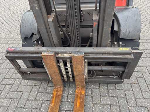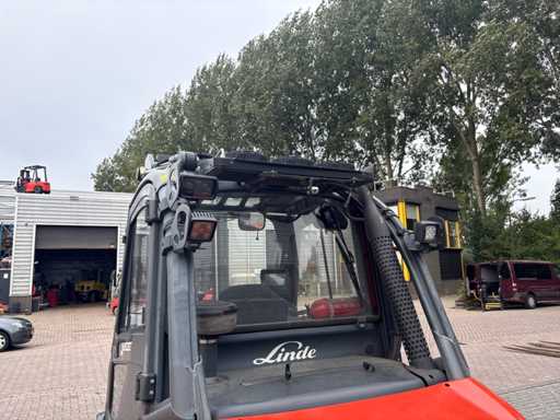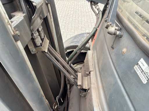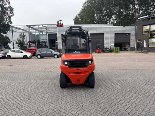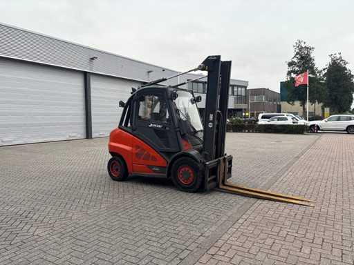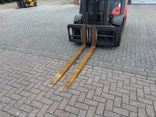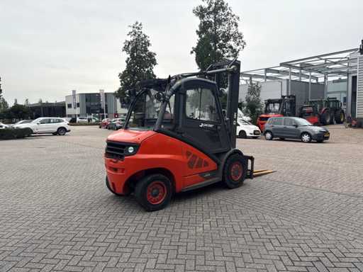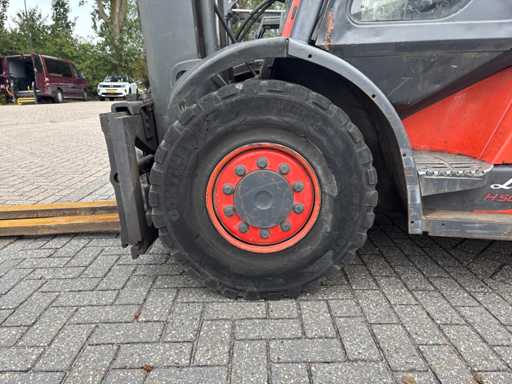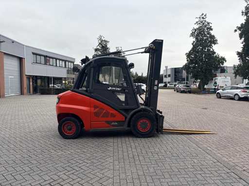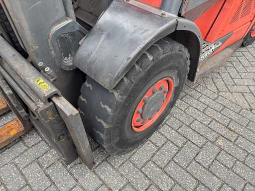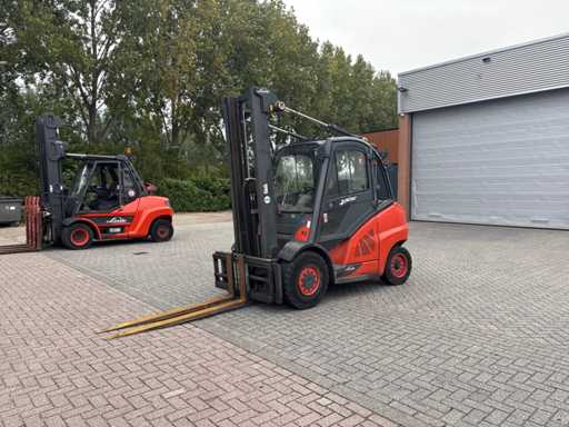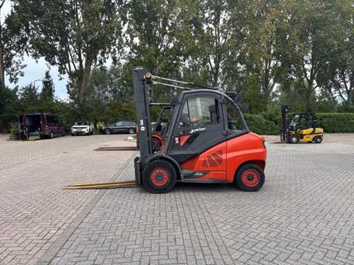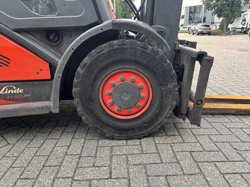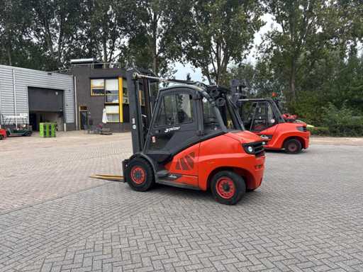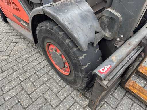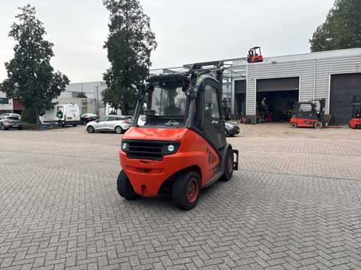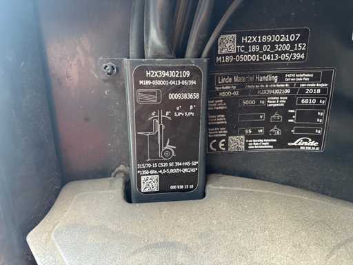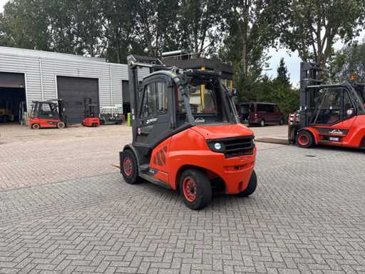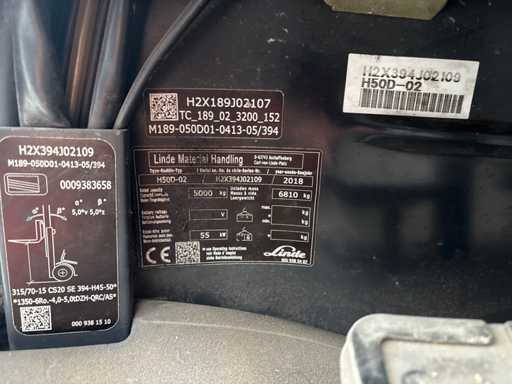 Chariot élévateur Linde, type H50D-02, année de construction 2018, numéro de série H2X394J02109. Le chariot élévateur est propulsé par un moteur diesel d’une puissance de 55 kW. Le poids propre est de 6 810 kg et la capacité de levage est de 5 000 kg.