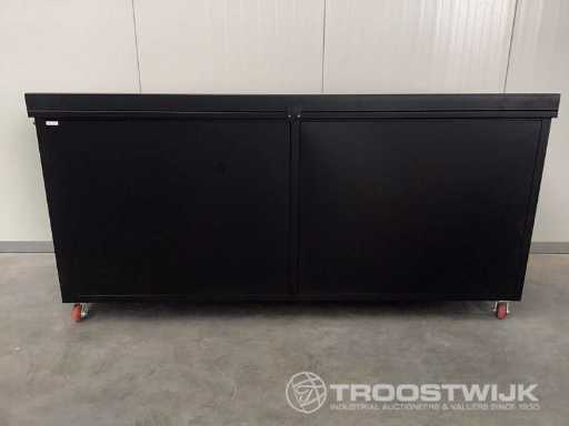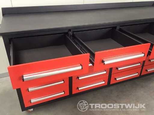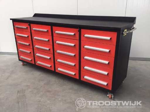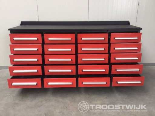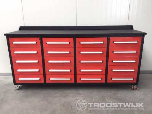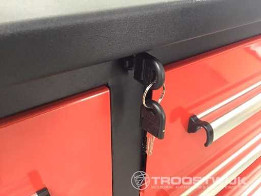 équipé de 2x clé ; 2x support de suspension ; 20 tiroirs ; Système coulissant en 3 parties ; tapis antidérapant ; Roues; poignée latérale ; Nombre de tiroirs : 20 ; acier : oui ; Lame en acier : Oui ; dimensions totales LxlxH : 2225x650x1140 ; poids propre : 275 kg ; © inutilisé
