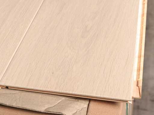 Facile à poser grâce au système d’encliquetage 5G, adapté à tous les types de sols et de chauffages rafraîchissants, parquet de qualité, le sol est en bois de chêne européen de haute qualité, traité prêt à l’emploi, épaisseur 14 mm, couche supérieure 3 mm, 35 paquets de 2,77 m2