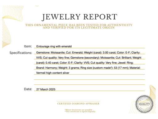 pierre précieuse émeraude : moissanite ; Coupe : Émeraude ; Poids (carat) : 3,00 carats ; Couleur : E-F ; Pureté : VVS ; Qualité de la coupe : Très jolie ; Pierre précieuse (secondaire) : Moissanite ; Coupe : Brillant ; Poids (carat) : 0,40 carat ; Couleur : E-F ; Pureté : VVS ; Qualité de la coupe : Très jolie ; Joyau : Anneau ; Marque : Harmony ; Poids : 3 grammes ; Taille de la bague (sur mesure*) : 53 (17 mm) ; Matériau : Vermeil en argent à haute teneur ; État : Neuf ; Emballage : boîte à bijoux ou étui en velours ; Explication : La qualité a été prise du rapport correspondant à l’article. L’évaluation est une évaluation d’un négociant certifié en diamants, basée sur les prix à la consommation ; Informations supplémentaires : Le poids mesuré des pierres précieuses est basé sur la taille des diamants ; Prix grand public : 1 200 €
