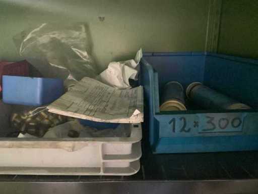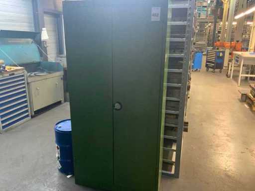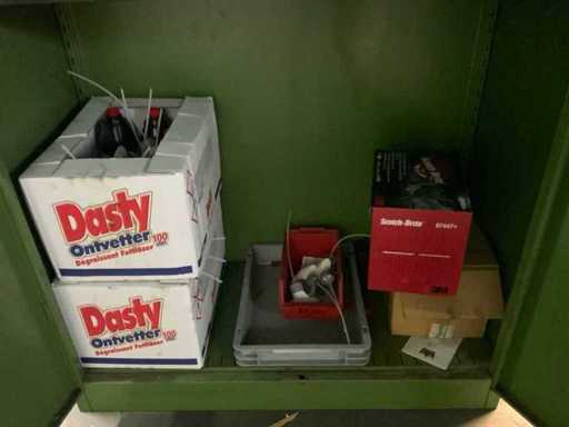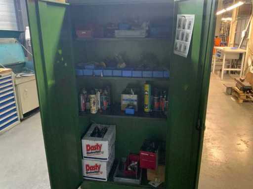 Équipé de 3 étagères. Contenus comprenant, entre autres : raccords de tuyau, polissage à métaux, pulvérisation antirouille