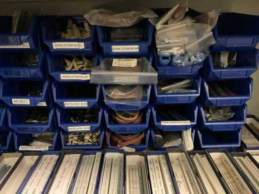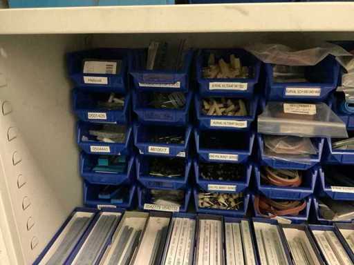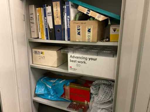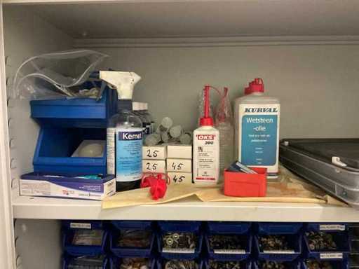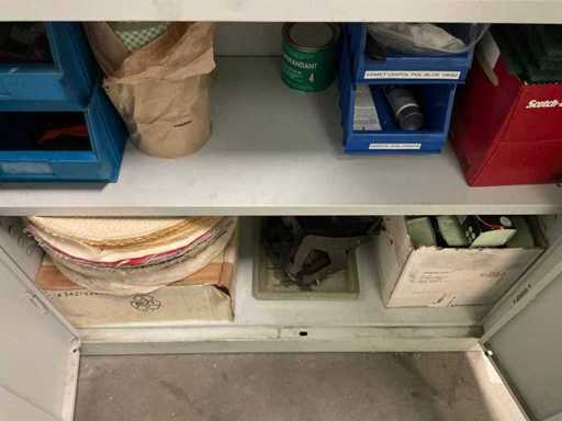 3 armées, taille par armoire 92x42x195 cm, avec leur contenu, incluant des pinceaux à polir, des stylos à polir, des disques à polir, des boîtes avec div. Des dossiers Gesswein, Kurval en pierre à aiguiser, ainsi qu’une table avec unité à tiroirs