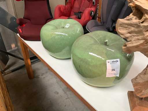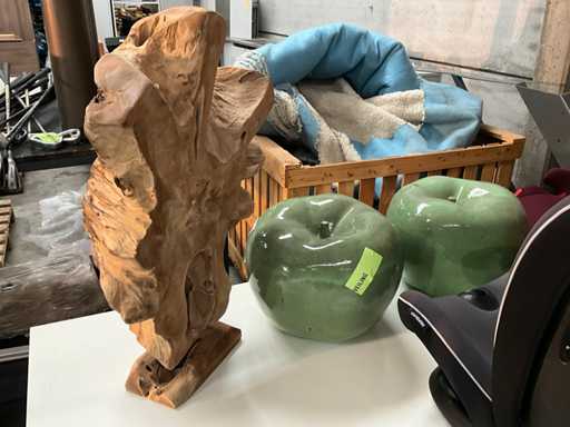 Composé de 2x pierre émaillée en pierre vert pomme de diamètre de 40 cm, + 1x pièce en bois sur pied de 25x50x80 cm