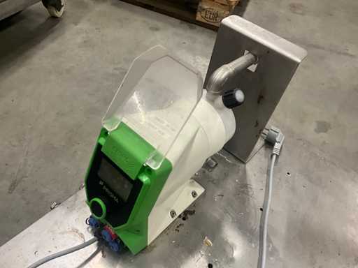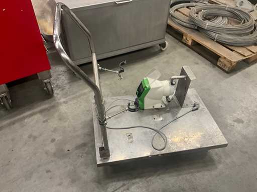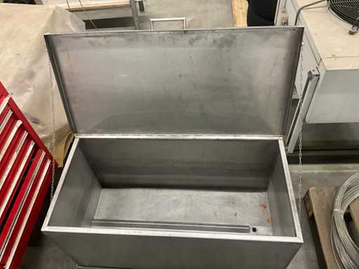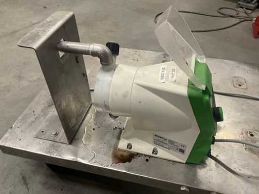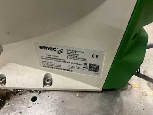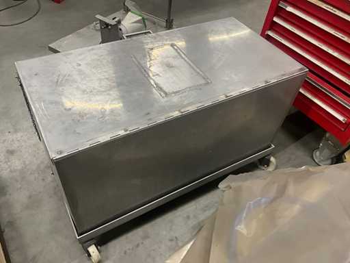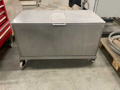 Composé d’un boîtier de rangement en acier inoxydable de 100 x 50 x 63cm sur une base mobile, complet avec un chariot plateforme en acier inoxydable équipé d’une pompe doseuse Emec Prisma