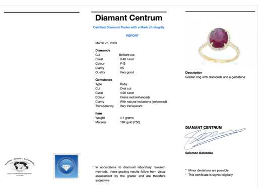 Diamant : Naturel ; Coupe : Coupe brillante ; Poids (carat) : 0,40 carat ; Couleur : F-G ; Pureté : USA ; Qualité de la coupe : Très jolie ; Pierre précieuse : Rubis ; Quantité : 1 pièce ; Coupe : Ovale ; Poids (carats) : 4,00 carats ; Couleur : Rouge intense (amélioré) ; Pureté : Avec des inclusions naturelles (améliorées) ; Dimensions : 10,0 x 8,0 mm ; Joyau : Anneau ; Poids : 4 grammes ; Taille de la bague (sur mesure*) : 53 (17 mm) ; Matériau : or 18K (750) ; État : Neuf ; Emballage : Boîte à bijoux de luxe ; Explication : La qualité a été prise du rapport correspondant à l’article. L’évaluation est une évaluation d’un négociant certifié en diamants, basée sur les prix à la consommation ; Prix à la consommation : 3 868 €