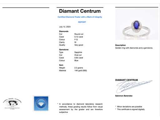 saphir Diamant : Naturel ; Coupe : Coupe ronde ; Poids (carats) : 0,12 carat ; Couleur : F-G ; Pureté : SI ; Qualité de la coupe : Très jolie ; Pierre précieuse : Saphir ; Coupe : Ovale ; Poids (carats) : 0,65 carat ; Joyau : Anneau ; Poids : 2,2 onces ; Taille de bague (sur mesure*) : 54 (17,25 mm) ; Matériau : or 14 carats (585) ; État : Neuf ; Emballage : Boîte à bijoux de luxe ; Explication : La qualité a été prise du rapport correspondant à l’article. L’évaluation est une évaluation d’un négociant certifié en diamants, basée sur les prix à la consommation ; Prix à la consommation : 1 785 €
