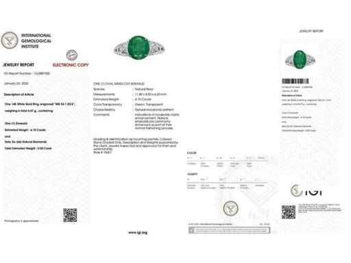 Bague de luxe en émeraude vert Zambia naturel, 4,60 carats en or blanc 14k, poids total 4,47 gr. Pierre centrale : une émeraude vert Zambia naturelle taille ovale de 4,10 carats avec 66 diamants brillants ronds F-G/VS-SI de 0,50 carat. Certifié par IGI Labaratoire, l’un des plus grands instituts indépendants de certification et d’évaluation de pierres précieuses au monde. Pour plus d’informations, consultez le certificat. Les bijoux sont en réalité meilleurs que les photos. Prix estimé au détail : 14 450 €.