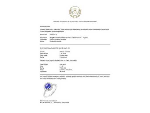 Bague de luxe en tanzanite naturelle AAA+ 1,78 carats en or blanc 18 carats 3,71 grammes, avec une tanzanite naturelle de haute qualité en forme ronde 1,42 carats et 28 diamants naturels taille brillante de 0,36 carats. La tanzanite est une pierre précieuse extrêmement rare, que l’on ne trouve qu’en un seul endroit au monde, la Tanzanie. Cette source unique devrait s’épuiser dans 15 à 20 ans, c’est pourquoi la tanzanite est également une pierre parfaite pour l’investissement. Certifiée par DIA Suisse. Pour plus d’informations, consultez le certificat. Le vrai joyau est plus beau que sur ses photos. Prix estimé par le détaillant : 7 950 € -