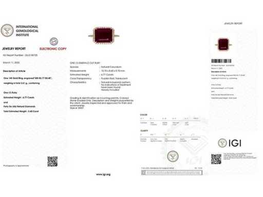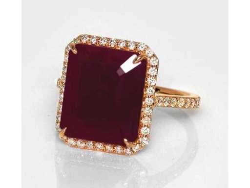 Bague de luxe rubis rouge violacé naturel 7,17 carats en or rose 14 carats de 3,61 grains avec un rubis rouge violacé en forme d’émeraude non chauffé de 6,77 carats et 46 diamants ronds rose naturel brillant de 0,40 carat. Certifié par IGI, l’un des plus grands instituts indépendants de certification et d’évaluation de pierres précieuses au monde. Pour plus d’informations, consultez le certificat. Les bijoux sont en réalité meilleurs que les photos. Prix estimé au détail : 10 850 €.