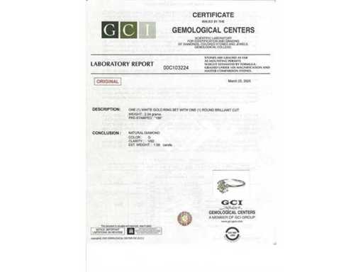 Bague solitaire de luxe en diamant naturel, 1,58 carat en or blanc 18 carats, poids total 2,24 gr. La pierre centrale est un diamant naturel en rond brillant, TOP de couleur G/VS2 de 1,58 carat... Certifiée par GCI Laboratoire, l’un des plus grands instituts internationaux pour la certification et l’évaluation des diamants et pierres précieuses. Pour plus d’informations, consultez le certificat. Les bijoux en réalité valent mieux que les photos. Prix estimé par le détaillant : 34 950.-