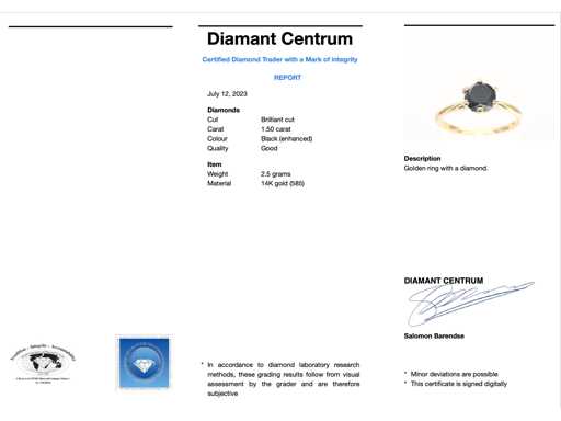 brillante Diamant : Naturel ; Coupe : Coupe brillante ; Poids (carat) : 1,50 carat ; Couleur : noir (amélioré) ; Coupe : magnifique ; Joyau : Anneau ; Poids : 2,5 onces ; Taille de bague (sur mesure*) : 54 (17,25 mm) ; Matériau : 14 carats (585) ; État : Neuf ; Emballage : Boîte à bijoux de luxe ; Explication : La qualité a été prise du rapport correspondant à l’article. L’évaluation est une évaluation d’un négociant certifié en diamants, basée sur les prix à la consommation ; Prix à la consommation : 1 540 €