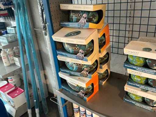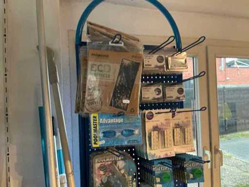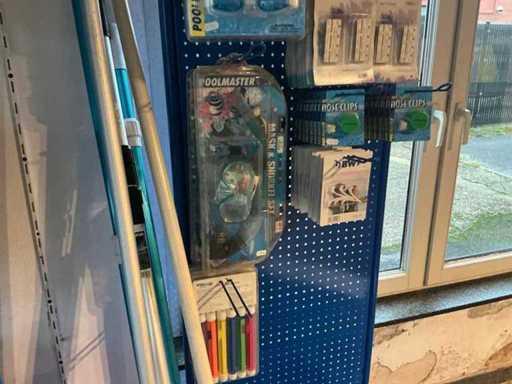 environ 200 articles, dont filets, brosses, divers produits, jouets, lunettes de plongée, tuyaux d’aspirateur, ....