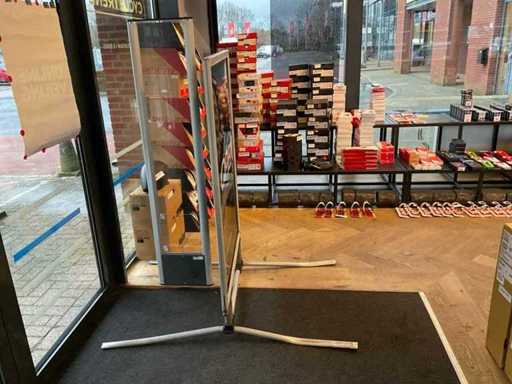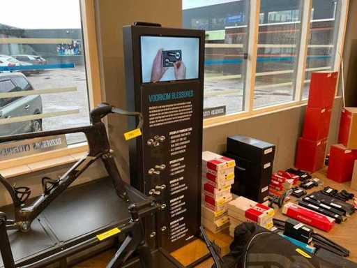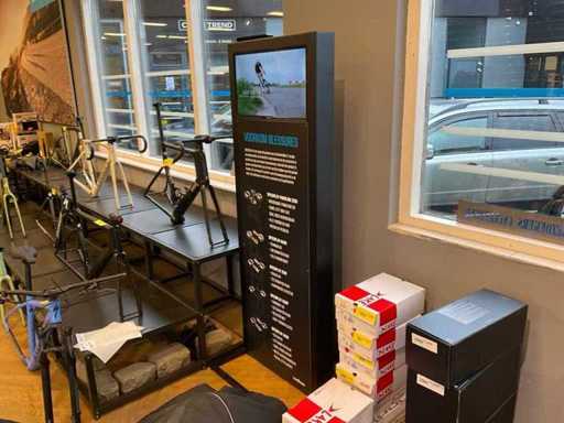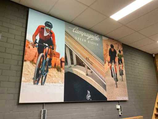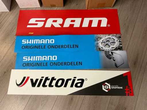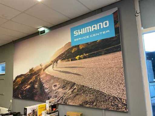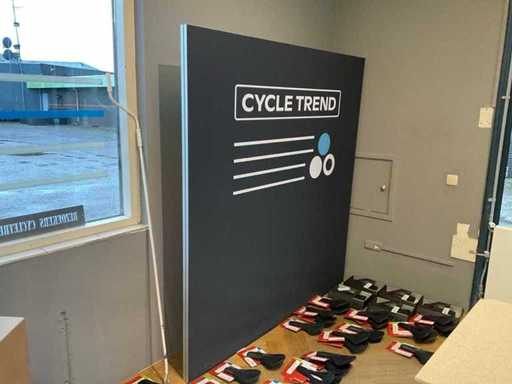 Comprenant : publicité lumineuse Shimano (démontage derrière la partie du plafond), publicité murale Shimano (environ 375x200 cm), panneau de trottoir Cycle Trend (environ 140x90x150 cm) et panneau mural (environ 190x200 cm), colonne publicitaire Wahoo avec moniteur (environ 60x65x185 cm), publicité murale Cycle Trend (environ 300x180 cm)